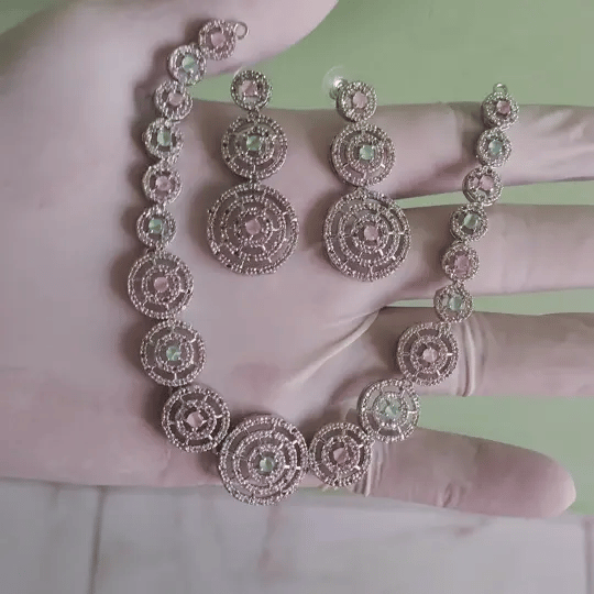 Elevate your style with this premium dual-tone necklace set featuring alternating soft pink and ocean blue stones, perfectly encased in a concentric circular American Diamond (AD) design. The silver-tone finish adds a sophisticated shine, making it ideal for bridal wear, festive events, and special occasions. The set includes a statement necklace and matching drop earrings, designed for comfort and long-lasting wear.