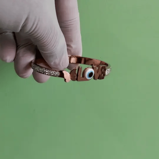 Featuring the word LOVE in bold letters, a graceful butterfly charm, and a protective blue evil eye centerpiece, this bracelet blends modern style with symbolic meaning. The sparkling cubic zirconia-style stones on each side add a touch of glamour, while the gold-tone finish ensures a rich, premium look.