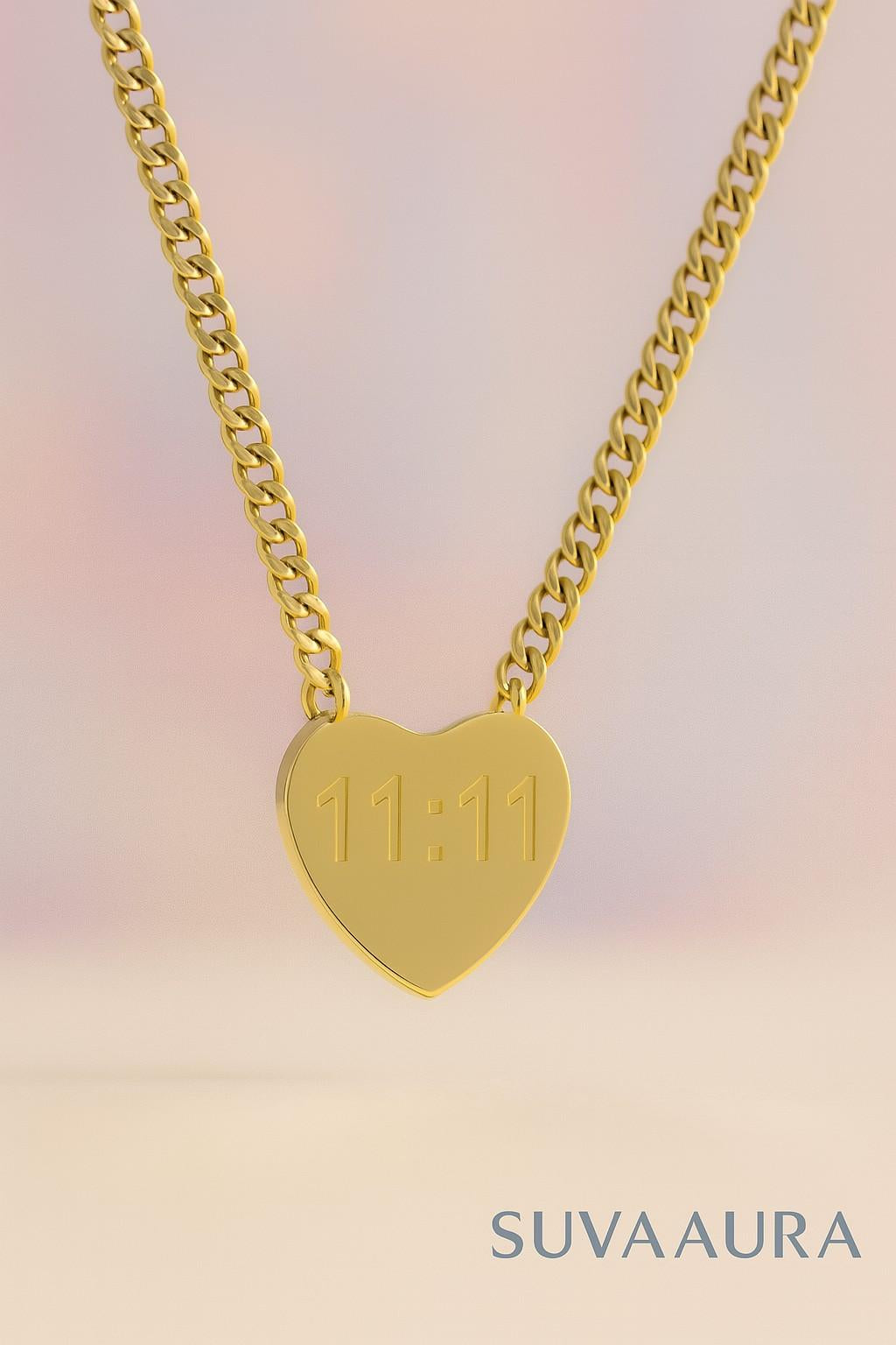 Minimalist Heart Pendant Necklace with 11:11 Angel Number Engraving – Suvaaura