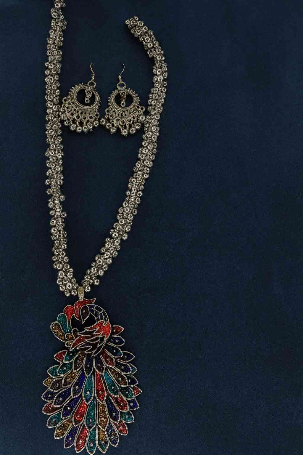 Elevate your ethnic and bohemian look with this exquisite multi-color peacock pendant necklace set, paired with matching designer earrings. The intricately crafted pendant features vibrant enamel detailing in red, blue, green, and gold tones, making it a statement accessory for festive occasions, weddings, or casual styling. The beaded metallic chain enhances the antique charm, while the lightweight earrings complete the traditional yet trendy vibe. Perfect for sarees, lehengas, kurtis, and Indo-western outfits. A must-have in every jewelry collection.