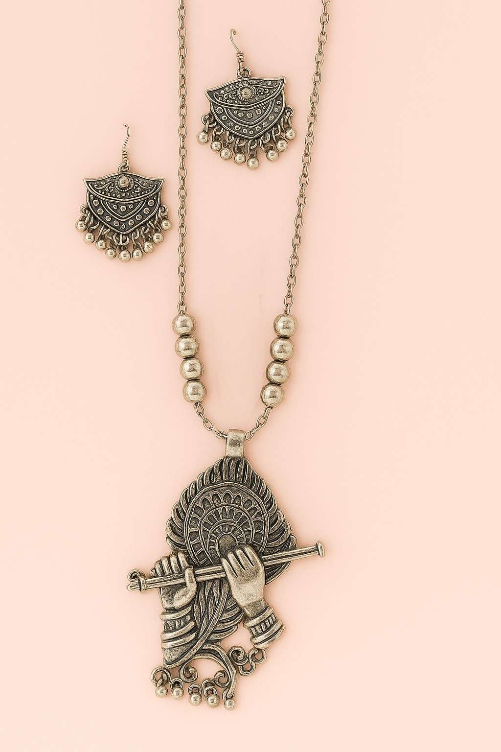 Oxidized Krishna Flute Pendant Necklace Set with Earrings – Antique Silver Tone