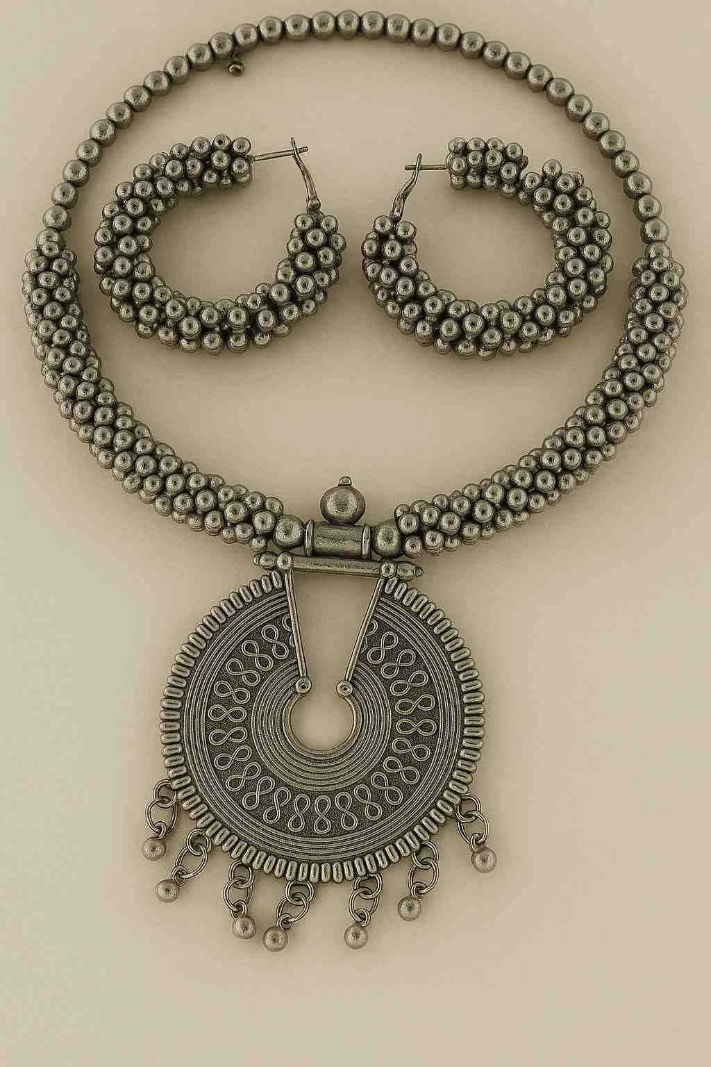 Oxidized Silver Beaded Choker Necklace Set with Antique Round Pendant & Hoop Earrings – Ethnic Jewellery for Women