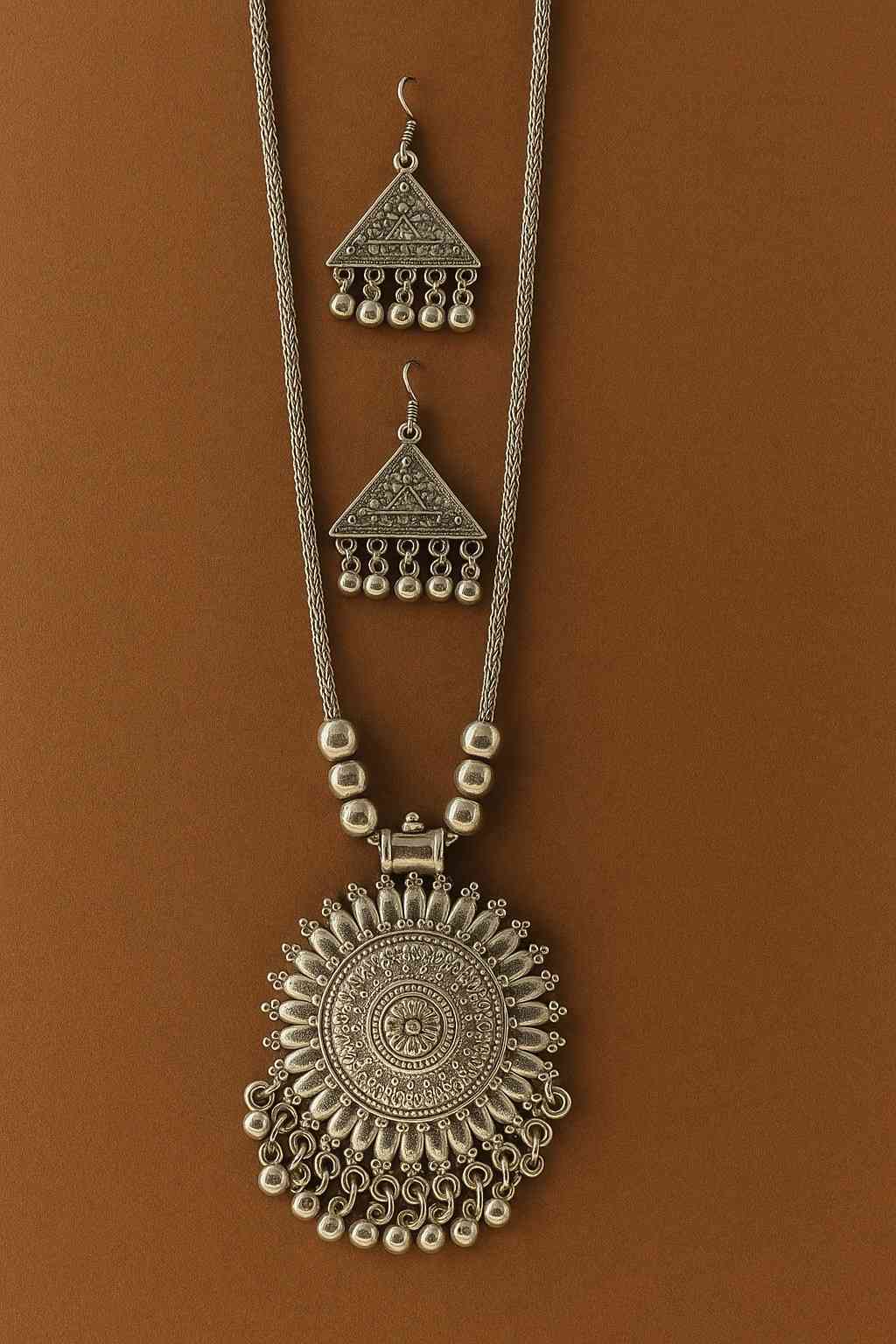 Elevate your ethnic and bohemian style with our Oxidized Silver-Tone Sunburst Pendant Necklace Set, beautifully paired with intricate triangle-shaped jhumka earrings. Crafted with fine detailing, the large circular pendant features a stunning sunburst design with delicate chain danglers, giving it a timeless appeal. The matching triangular jhumkas add a unique charm, making this set perfect for festive occasions, traditional events, and statement styling. Lightweight and comfortable, it complements sarees, lehengas, kurtas, and Indo-western outfits effortlessly.