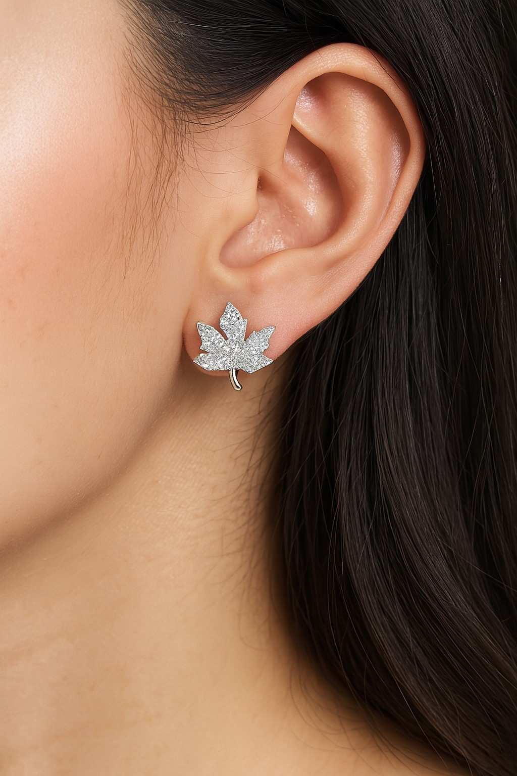 Bring the beauty of nature to your jewelry collection with our Elegant Silver-Tone Maple Leaf Crystal Stud Earrings.